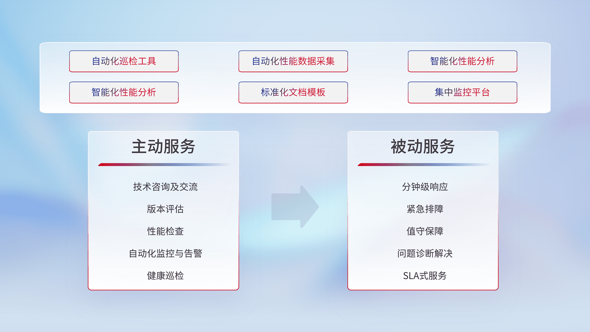 智能化工具和标准化文档,,,保障服务质量,,提供主动服务(包含技术咨询、、版本评估、、性能检查、、、自动化监控与告警、、健康巡检)和被动服务包含(分钟级响应、、紧急排障、、、、值守保障、、、问题诊断解决、、、SLA服务)。。。